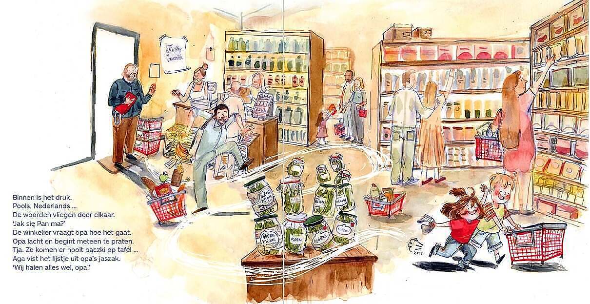 Aga en Kamil gaan met opa en met mama’s boodschappenlijstje naar de Poolse winkel.