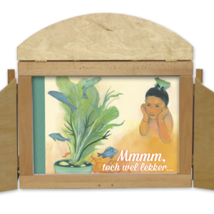 Met deze vertelplaten of kamishibai kan je het verhaal ook in groep vertellen en bespreken. De tekst die hoort bij de voorste prent staat steeds op de achterzijde van de laatste prent.